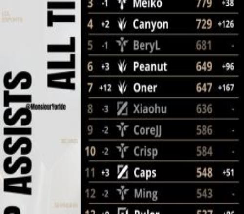 体育资讯11月6日报道宣称 今日外媒统计全球总决赛最新助攻榜,从数据来看,Faker、Keria选手有望在11月9日的决赛达成破千成就,而Keria选手也有望超越Faker选手来到助攻榜第一的位置。