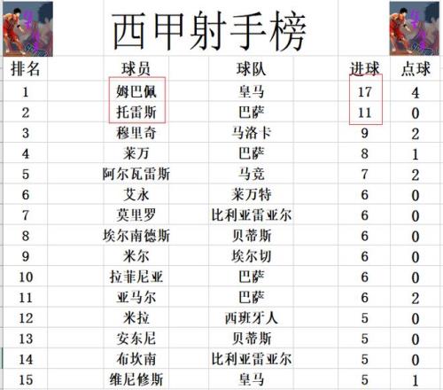 射手榜方面,姆巴佩今天打入一球,17球继续高居榜首,将和托雷斯的差距拉大到6球。穆里奇9球排在第3,莱万8球位列第4。维尼修斯今天未能进球,还是差1球才能追上拉菲尼亚,亚马尔等人挤入前十。