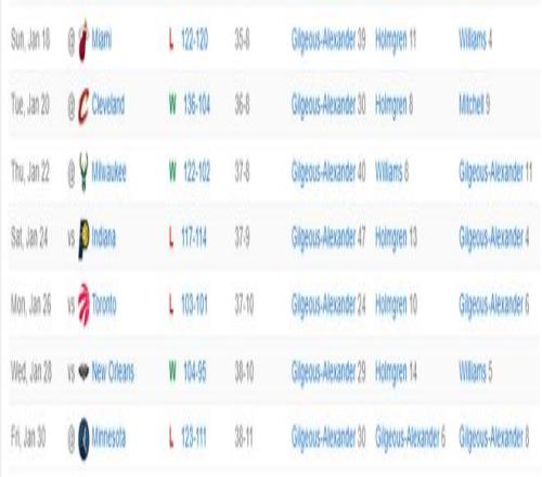 这场比赛SGA延续了连续119场20+的纪录,他距离张伯伦连续126场20+的纪录只差7场,这场比赛SGA真的是被迫背锅的。