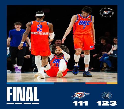 杰林威廉姆斯轰进三分球,爱德华兹2罚全中,多尔特失误,爱德华兹单打多尔特中投得分,森林狼重新取得20分领先。亚历山大快速上篮取分,戈贝尔补篮打进,距离终场仅剩4分09秒,戴格诺特请求暂停并换上板凳席末端的球员,选择提前认输,比赛就此失去了悬念。爱德华兹抛投命中,芬奇也换下了首发,两队开始在场上练兵,比赛时间逐渐走完。最终,森林狼以123比111完胜雷霆。