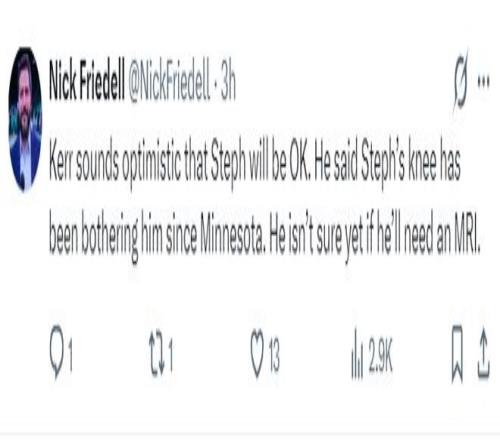 另一勇士队记尼克-福尔德则透露,虽然库里的右膝已经不适一周,但勇士队内还没有确定是否进行MRI检测,一切要看库里第二天起床后的感觉。