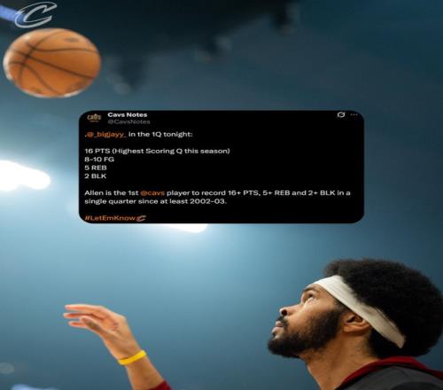 这场比赛是让杨瀚森竞争者克林根扎心一战,首节在克林根的防守下,骑士队中锋贾莱特-阿伦9分钟里,10中8,拿到16分5篮板1抢断2盖帽,命中率80%,在篮下有4次很轻松的暴扣,他成为骑士队史02-03赛季首位单场16+5+2盖帽的球员。