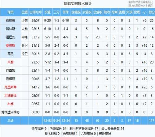 快船:伦纳德25分8板5助、米勒20分5板2助、科林斯16分9板2助、祖巴茨14分20板1助、桑德斯12分2板4助、邓恩8分5板3助、洛佩斯8分1板3助、克里斯蒂6分3板1助