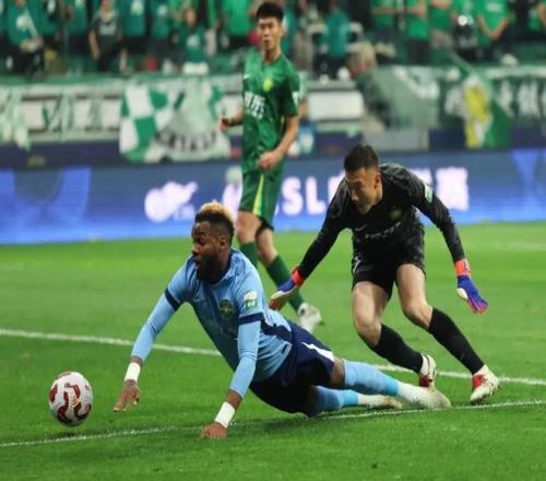 浙江俱乐部绿城队球员布彭扎(左)在比赛中拼抢。