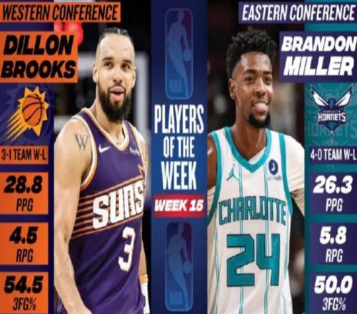 NBA官方公布了第15周的东西部周最佳球员,东部由黄蜂前锋米勒当选,西部由太阳后卫狄龙当选。米勒上周场均砍下26.3分+5.8篮板+2.3助攻,命中率高达50%,带领黄蜂队取得4胜0负的战绩。据统计,这是米勒生涯首次拿到周最佳。狄龙上周场均贡献28.8分+4.5篮板+2.8助攻,投篮命中率53.5%,三分命中率高达54.5%,带领太阳队取得3胜1负的战绩。据统计,这也是狄龙生涯首次获此殊荣。除此之外,骑士队的阿伦、尼克斯队的哈特、活塞队的康宁汉姆、76人队的恩比德、湖人队的东契奇、火箭队的杜兰特、森林狼队的华子、雷霆队的亚历山大和快船队的小卡等球星获得了周最佳提名。