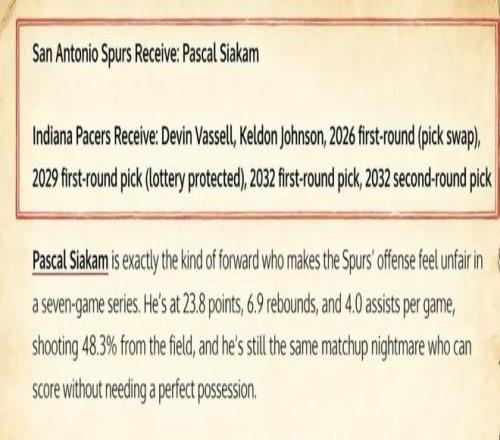 美媒《Fadeaway World》提出了一套6换1的交易方案,建议马刺引入步行者前锋西亚卡姆。具体方案为——