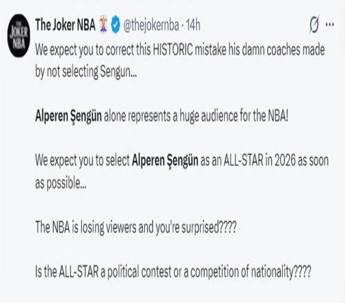 赛前美媒为申京未能入选全明星阵容抱不平,他直言教练们没有投票将申京选入全明星替补是一个严重的错误,希望萧华能让申京递补扬尼斯的席位入选全明星。