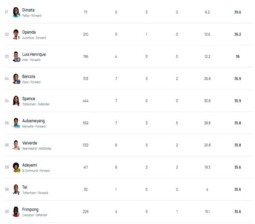 39.6kmh,帕福斯前锋迪马塔断层领先欧冠冲刺速度排行榜